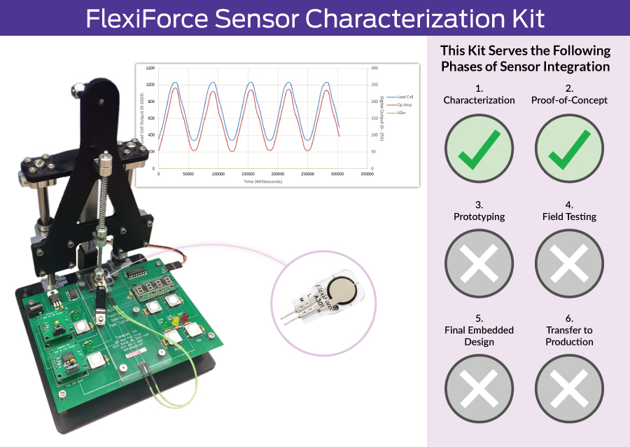 The FlexiForce™ Sensor Characterization Kit is a time-saving, affordable tool enabling engineers and designers to understand how FlexiForce sensors perform in a controlled loading environment.