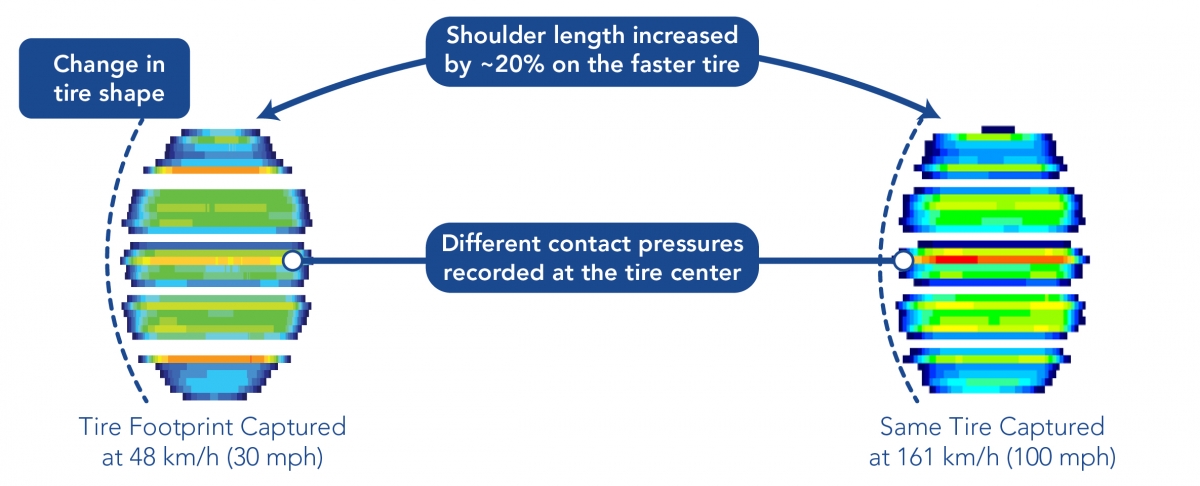 Tire Geometry RecognitionHigh Speed TireScanTM captures key tire shape changes that can occur from centrifugal forces at different speeds. This example shows how one tire design was affected when tested at 48 km/h (30 mph), and again at 193 km/h (120 mph). |