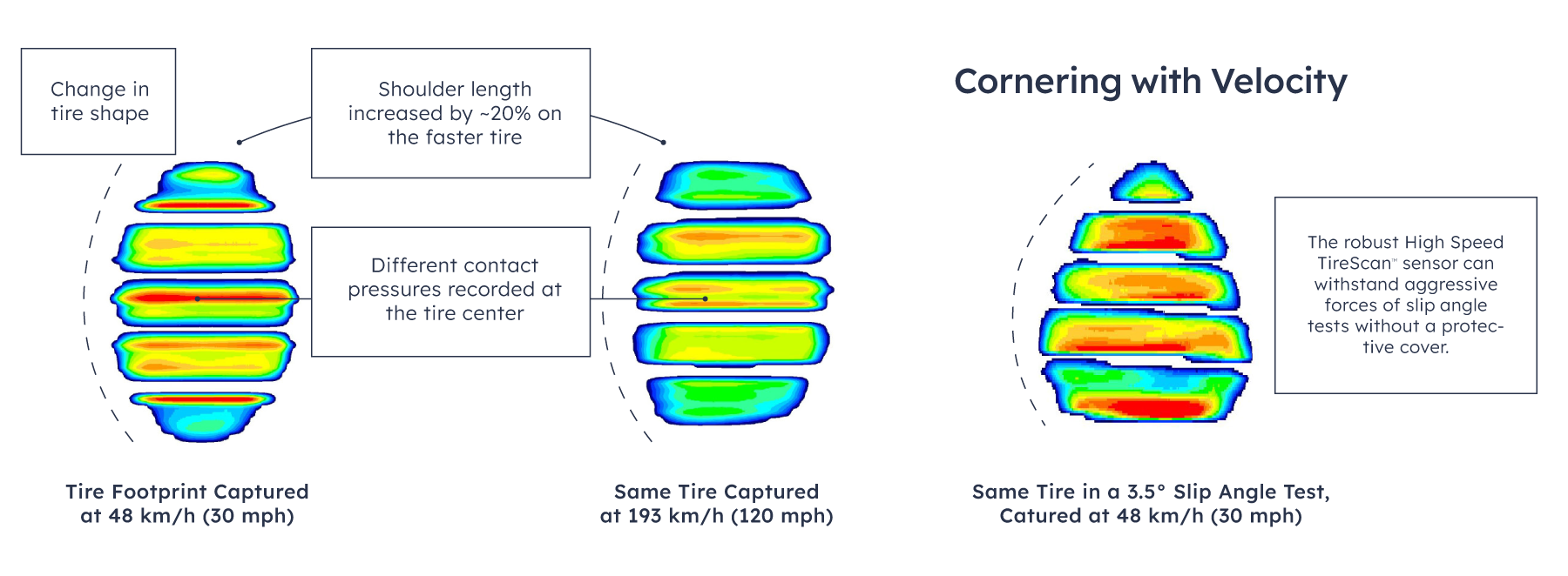 Tekscan’s High Speed TireScan™ system captures the impact of speed, motion, and inertial forces on a tire at speeds up to 265 km/h (165 mph). The robust array of pressure sensing elements scans at 20 kHz as the tire rolls across it. The software displays the tire shape and pressure distribution while in motion. The software displays the tire patch and pressure distribution while in motion.