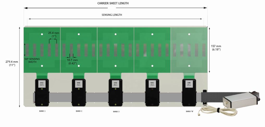 The NPAT is used to capture nip footprints and relative pressure distribution between nip rolls. The NPAT sensor band array can cover a very large area while utilizing one data acquisition handle.